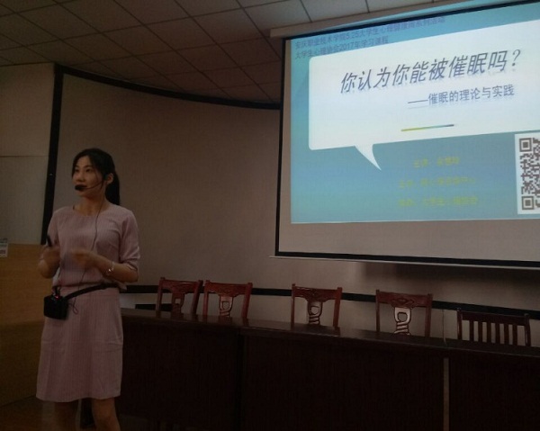 “5•25”系列活动之心理催眠体验5月26日下午在3号教学楼216教室如期举行。余慧玲老师带领学生进行了一次近距离体验心理催眠的活动,各系团总支书记、辅导员代表、心理咨询中心负责人、心理协会会员及其他同学40余人参加了体验活动。