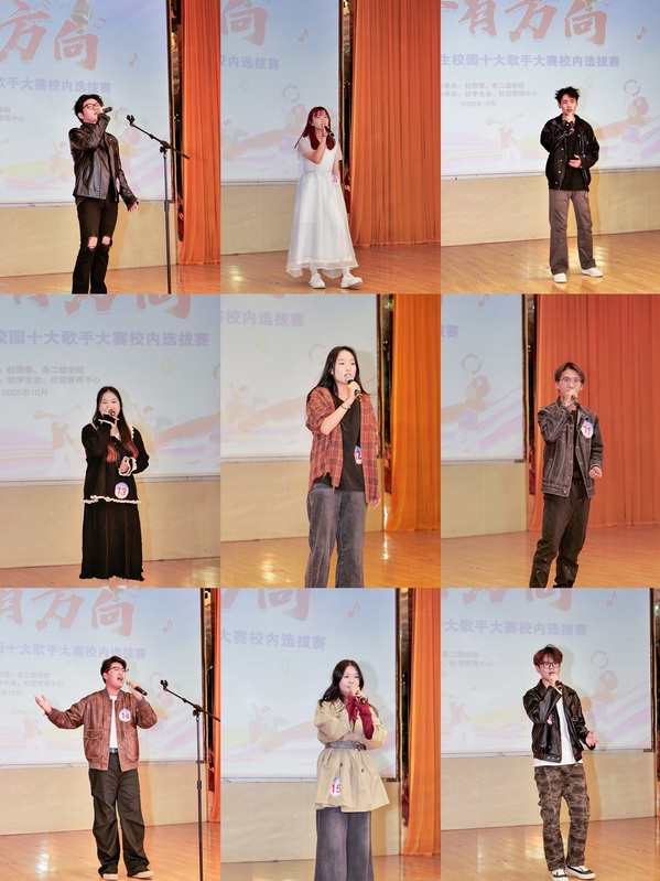 经过激烈角逐,最终有十位选手成功斩获校园“十大歌手”荣誉称号。其中,姚日诚同学以一曲《寂寞先生》深情叩问人心,户志豪同学借《悟空》展现不凡声线,两人以同分佳绩并列本次选拔赛冠军;潘希悦演绎的《下一个天亮》清澈动人,吴骏奇带来的《歌曲串烧》编排巧妙,舞台表现力十足,双双荣获亚军;俞子俊以《我爱你中国》传递深沉家国情怀,孔德琦则凭借《三国恋》融合古今风格,共同斩获季军。