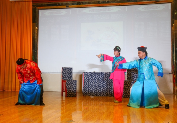 新编小戏《二妹子闹元宵》率先登台,演员们身着质朴灵动的戏服,通过黄梅戏花腔小调的唱腔表现形式,把老百姓小人物的憨厚质朴展现得淋漓尽致。传统小戏《打豆腐》将点燃现场欢乐气氛,演员们夸张传神的肢体动作、活灵活现的表情神态、惟妙惟肖的生动演绎,让台下同学笑得前仰后合。《天仙配》选场“路遇”的熟悉旋律缓缓流淌,现场瞬间陷入静谧,传统神话故事的缱绻意蕴娓娓道来。演出最后,《女驸马》选场“洞房”精彩上演,演员们身着绣工精美的戏服,头戴玲珑精致的头饰,一出场便惊艳四座,婉转多变的唱腔时而低沉压抑、时而高亢坚定,让同学们仿佛置身其中一起感受故事的跌宕起伏。