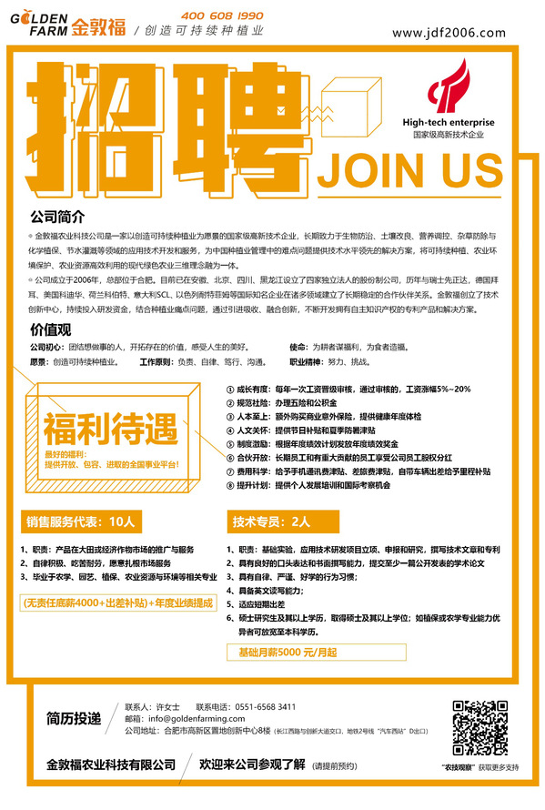 公司简介:金敦福农业科技公司是一家以创造可持续种植业为愿景的国家级高新技术企业,长期致力于生物防治、土壤改良、营养调控、杂草防除与化学植保、节水灌溉等领域的应用技术开发和服务,为中国种植业管理中的难点问题提供技术水平领先的解决方案,将可持续种植业、农业环境保护、农业资源高效利用的现代绿色农业三维理念融为一体。