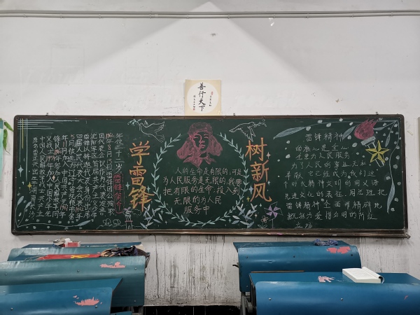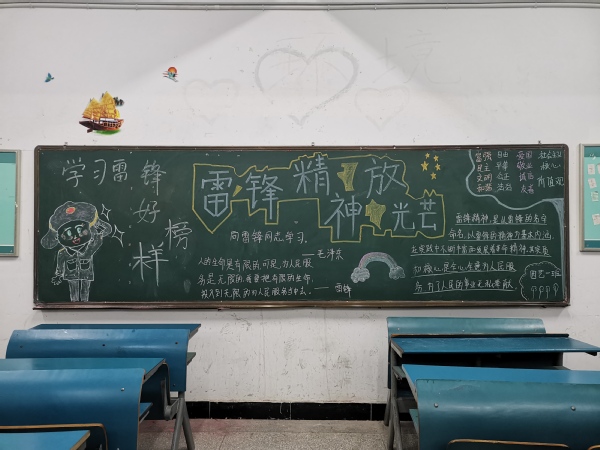 在主题板报活动中,各班积极参与,精心设计,充分利用校园文化黑板报这块宣传阵地,展现雷锋的形象,歌颂雷锋“全心全意为人民服务”的高尚品质,展示了同学们对雷锋精神的感悟和理解。