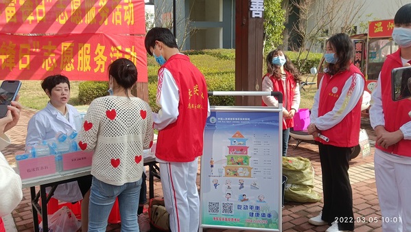 3月5日安庆市志愿服务联合会雷锋月启动仪式上,我院青年团员们积极听从现场任务分配,在社区外面组织引导人群有序开展活动。开幕式结束后,参与并帮助社区老人们免费测量血压、检测视力、维护现场秩序等。