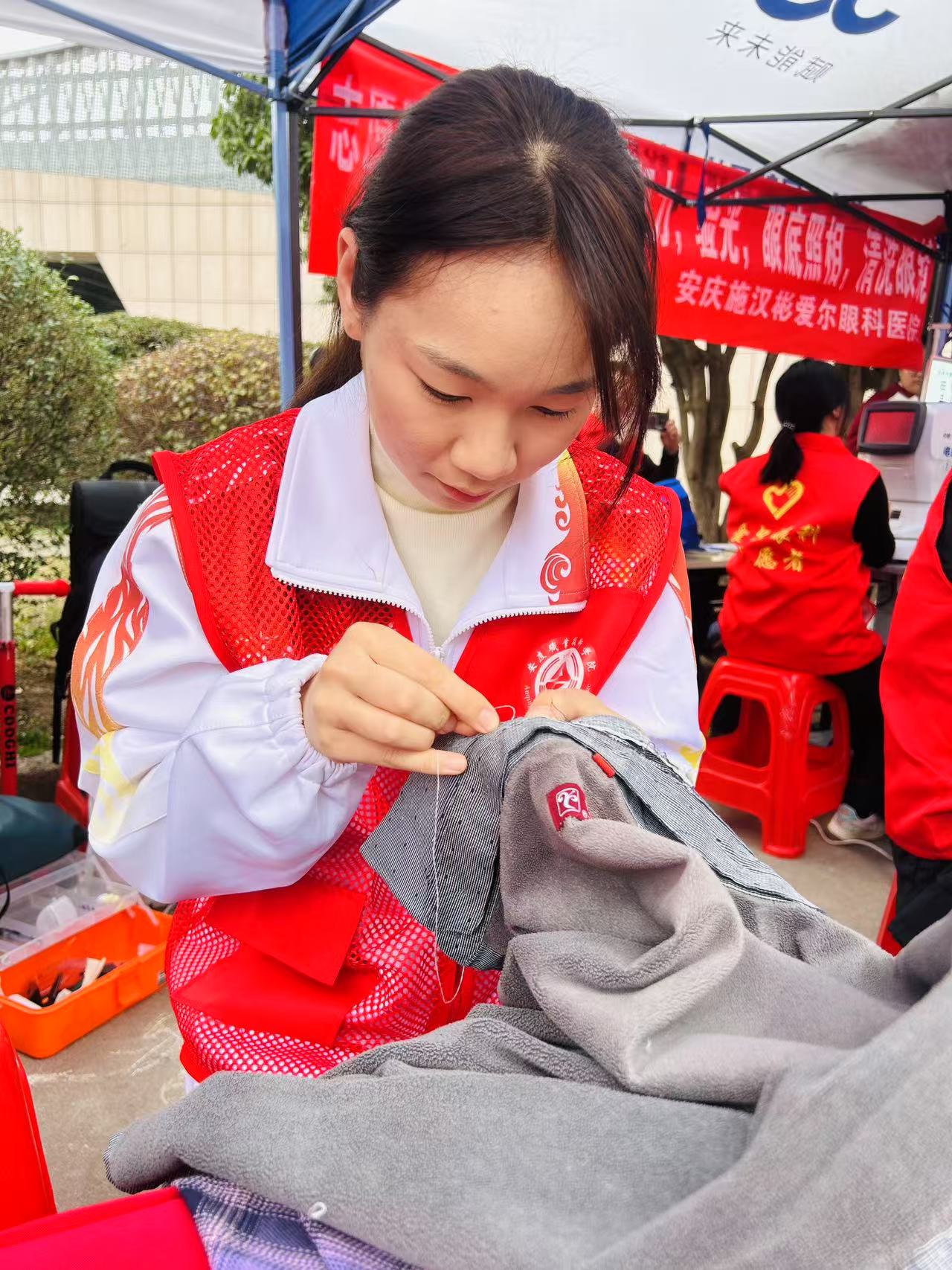 活动现场,服装团队党员教师带领服装设计与工艺专业学生,携带缝纫机、熨烫机等专业设备,为市民提供衣物缝补、熨烫等便民服务。学生们娴熟地穿针引线、调整熨斗温度,细致处理市民送来的衣物。从修补开线的校服到熨平褶皱的西装,志愿者们用专业技能让一件件旧衣焕发“新生”。市民张奶奶拿着缝补好的裤脚连连称赞:“这些孩子技术好、态度更暖心,真是把服务送到了我们心坎上!”