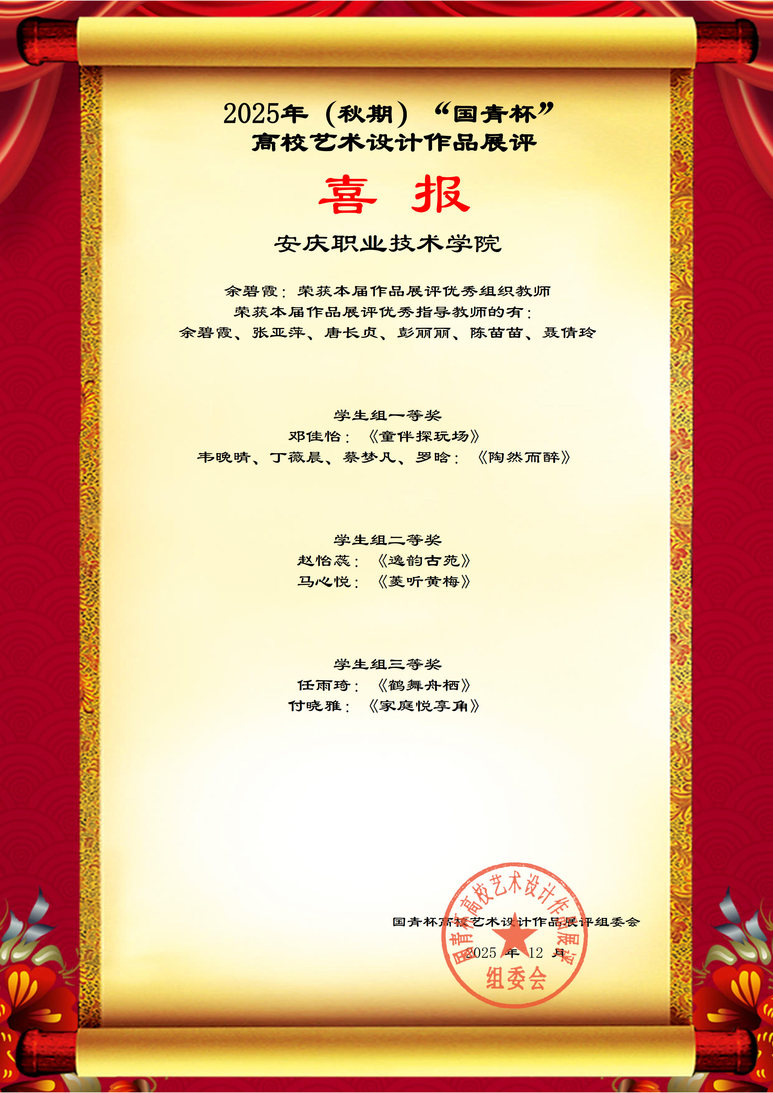 近日,以“智能·共生”为主题的2025“国青杯”全国高校艺术设计作品展评活动圆满落幕,经beat365官网园林技术专业师生共同努力,6件作品获得佳绩。