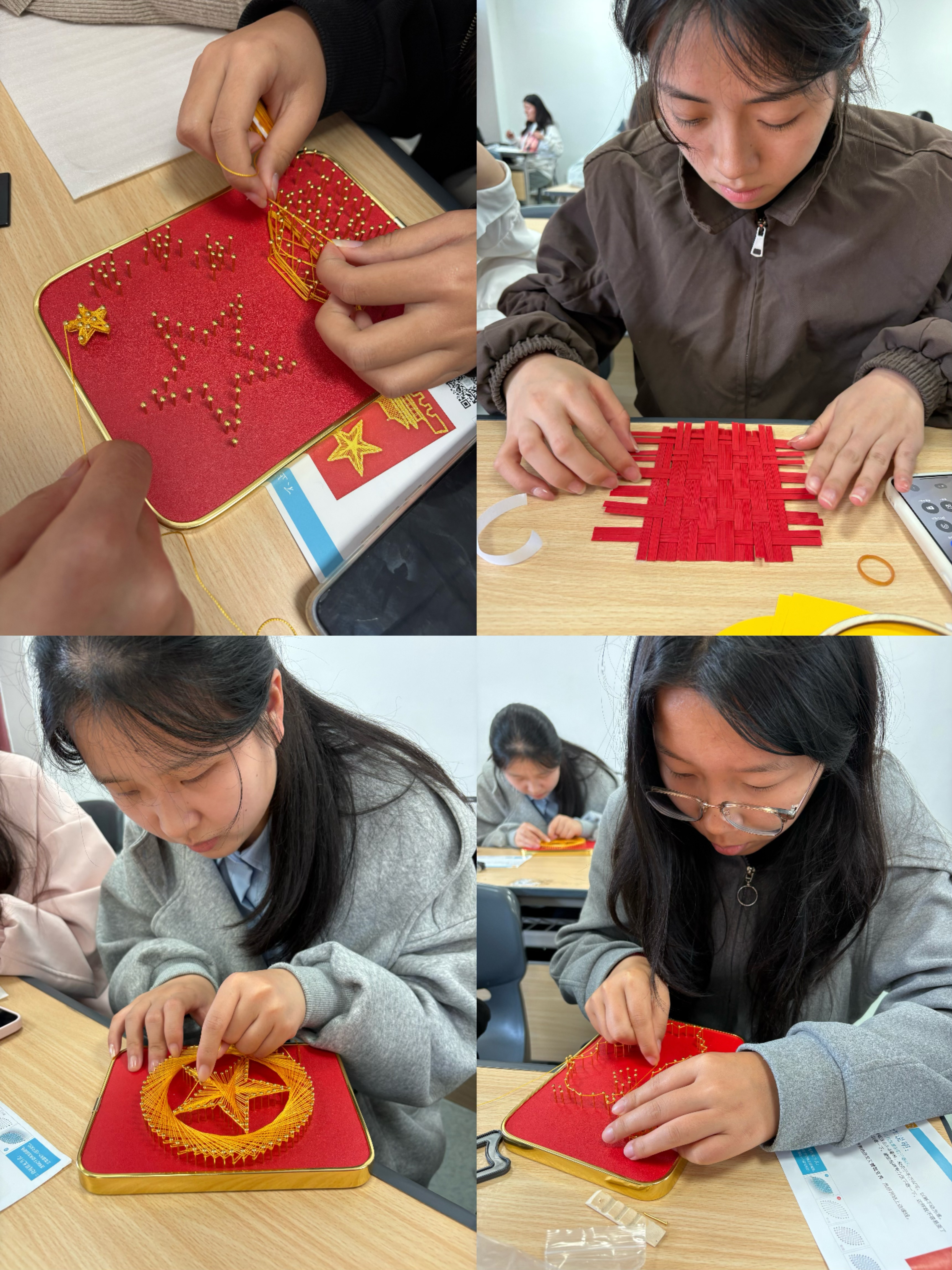 活动现场,党员教师手把手指导学生进行缠画创作。从丝线选材、图案设计到缠绕技法、造型固定,教师们耐心讲解、示范操作,学生们认真聆听、反复练习。师生共同围绕红色主题进行创作,将思政元素融入艺术设计。