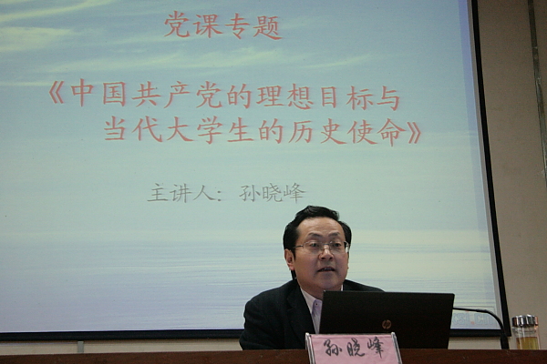 孙晓峰从党的最高纲领是实现共产主义、发展中国特色社会主义、全面建设小康社会的奋斗目标、树立和落实科学发展观、学习型党组织的建设、明确成才的方向和目标等五个方面深入浅出地阐述了中国共产党的理想目标与当代大学生应当肩负的历史使命。